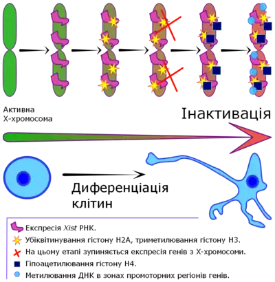 Процесс инактивации Х-хромосомы начинается с распространением Xist-РНК от Xic по всей хромосоме, где Xist-РНК, по-видимому, индуцирует образование и расширение области гетерохроматина. Гетерохроматин инактивированной Х-хромосомы характеризуется не только связью с Xist-РНК, но также наличием особого варианта гистона Н2А (macroH2A), гипоацетилированием гистонов Н3 и Н4, убиквитинированием гистона H2А и метилированием специфических позиций на гистоне Н3, а также метилирования ДНК. Именно комбинация подобных модификаций обусловливает большую часть инактивированной Х-хромосомы чрезвычайно невосприимчивой к транскрипции. Кроме того, способность этих модификаций к самораспространению обеспечивает поддержание инактивированного состояния Х-хромосомы в течение многих клеточных делений. Впрочем, стоит отметить, около 10 % генов на Х-хромосоме остаются транскрипционно активными[22].