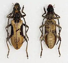 Усики короче тела или немного длиннее его. Вершина первого членика усиков заострённая. Боках переднегруди нет киля или бугорка. Переднеспинка сильно сужена спереди и сзади, с глубокой продольной бороздкой посередине. Надкрылья у вершины окаймлённые с шипами на вершине и вдоль шва[1]. Распространён в Индии, Мьянме и Таиланде[2], а также в Лаосе[3]. Кормовым растением является фикус каучуконосный[2].