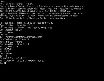 Yacas — программа для символьного вычисления математическими выражениями[5]. В ней используется собственный язык программирования, предназначенный как для символьных, так и для числовых вычислений произвольной точности. Его разработка началась в начале 1999 года.