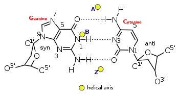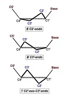 Ещё одной особенностью Z-ДНК является чередование конформаций нуклеотидных остатков. Дезоксицитидин находится в стандартной конформации: сахар в С2'-эндоконформации (см. рис.), а основание — в анти-конформации (то есть основание повёрнуто в сторону, противоположную гидроксильной группе при пятом атоме углерода; в таком положении находятся основания в полинуклеотидной цепи[11]). У дезоксигуанозина сахар находится в С3'-эндоконформации, а основание имеет крайне нетипичную син-конформацию[12].