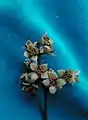 Цветки расположены метелками на концах ветвей, или в пазухах листьев, или на том и другом, и имеют длину 15-25 мм . Цветки сидячие или на цветоножках длиной до 2,5 мм, четыре чашелистика соединены у основания и имеют длину около 1 мм, четыре лепестка зеленовато-кремового цвета и 4-5 мм. Мужской цветок имеет четыре тычинки длиной 3,5-8 мм с пыльниками длиной около 3 мм. Женские цветки имеют один плодолистик длиной около 3 мм с коротким столбиком, иногда с рудиментарными тычинками. Цветение происходит с сентября по ноябрь, плод представляет собой блестящий ярко-красный, позже морщинистый темно-коричневый, сферический или овальный фолликул длиной 7-8 мм, содержащий одно чёрное семя[2][3][4][5].